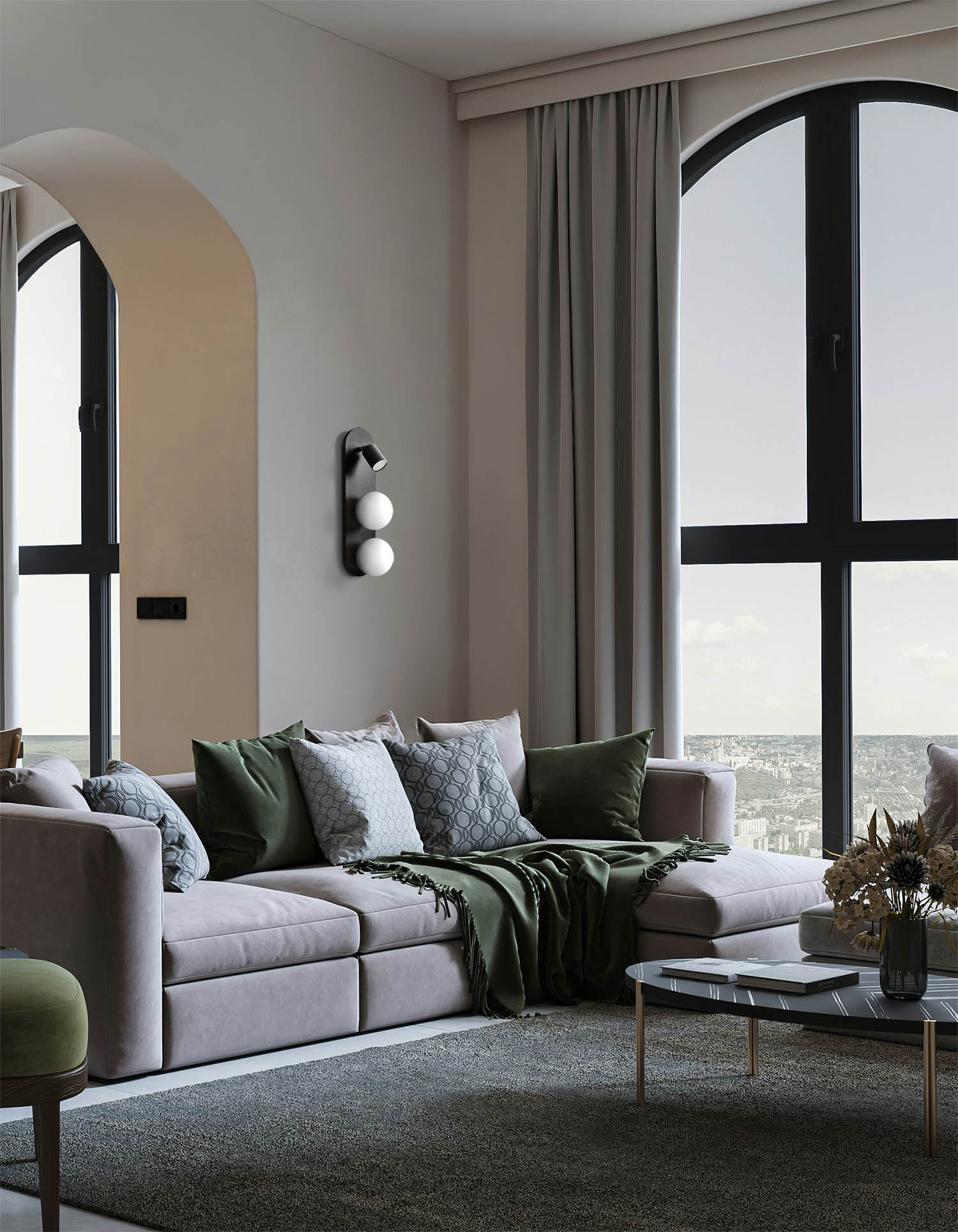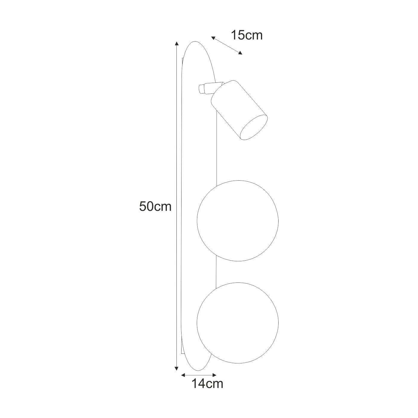Czarny kinkiet na ścianę z białymi mlecznymi kloszami i halogenem