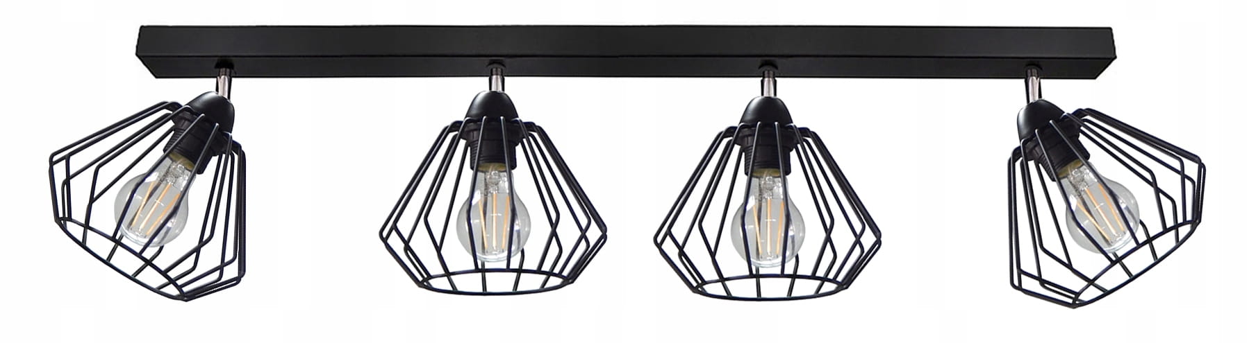 Czarny plafon na listwie z czterema metalowymi kloszami w stylu minimalistycznym. Nasza lampa będzie idealnym dopełnieniem przestrzeni w salonie, jadalni, kuchni, sypialni czy korytarzu.