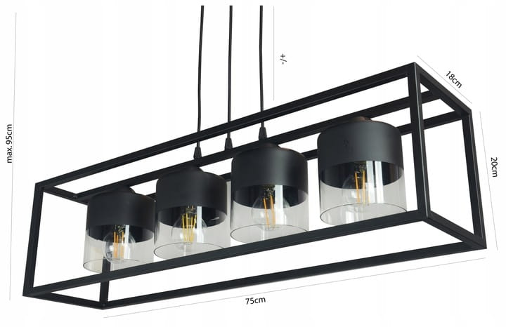 Wymiary: wysokość: 95 cm (regulowana), wymiary podsufitki 20 x 5 cm, wymiary lampy 75 x 18 x 20 cm, wymiary klosza: średnica 12 cm