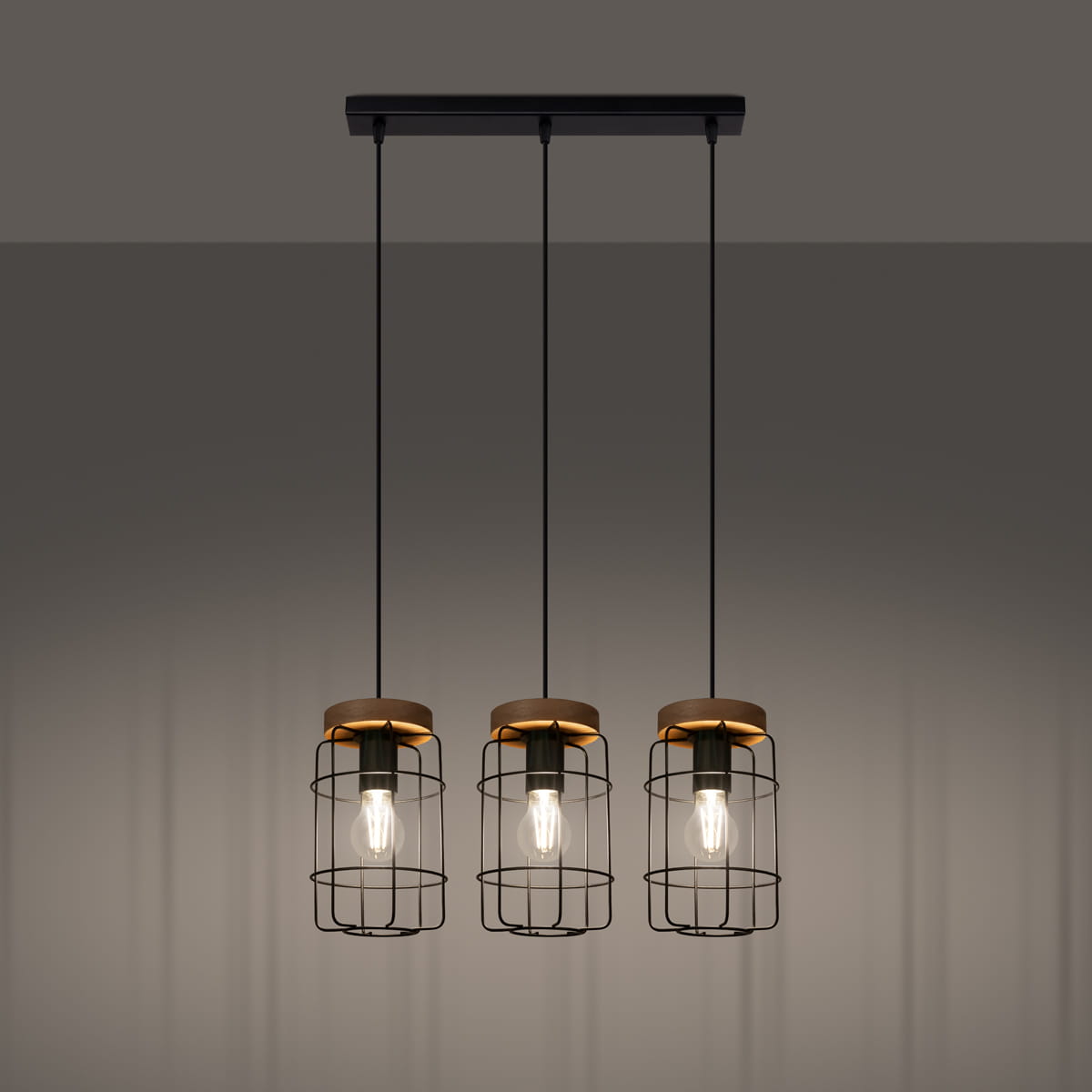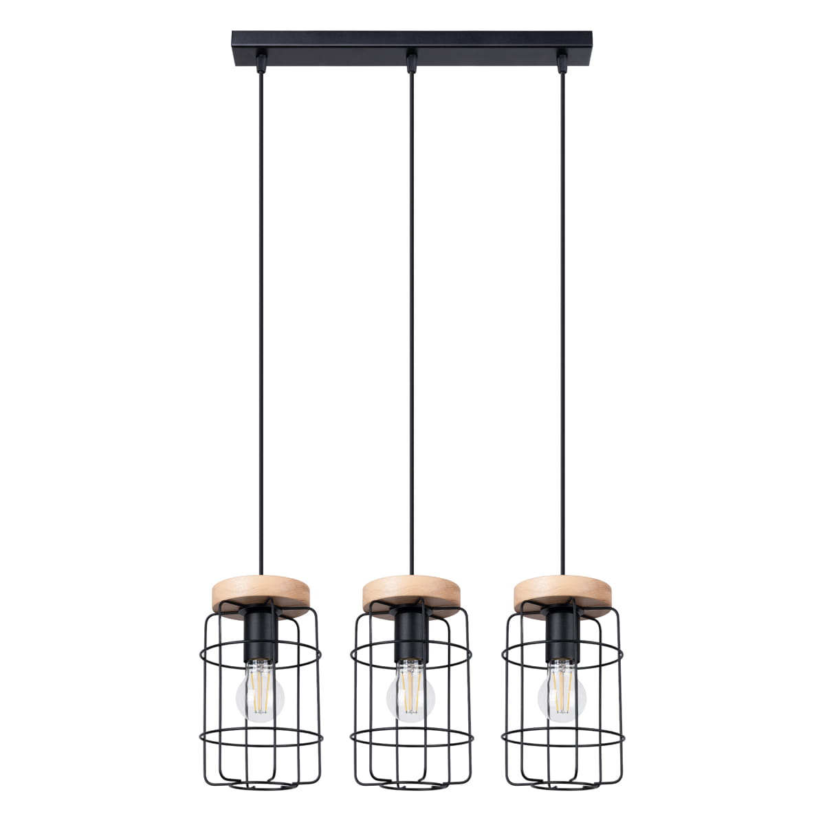 Lampa wisząca czarna stalowa trzy klosze z pręcikami drewno E27
