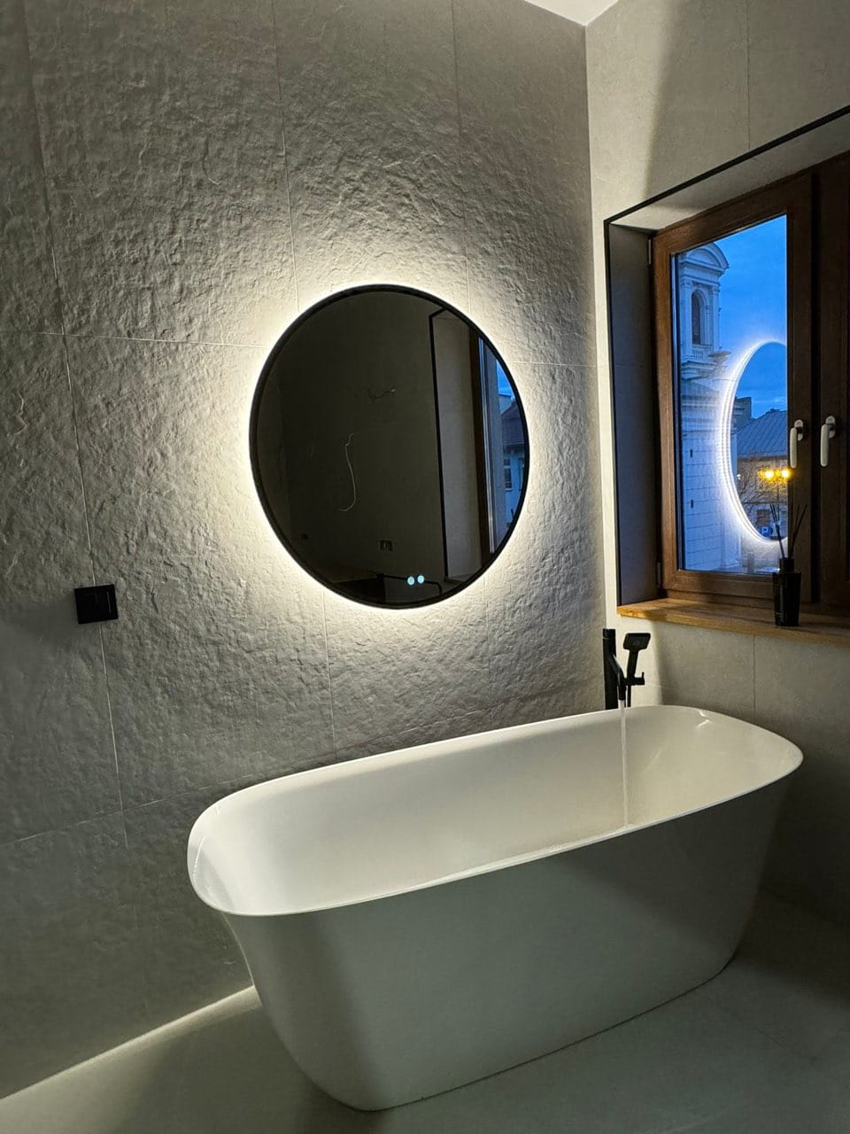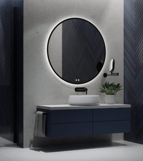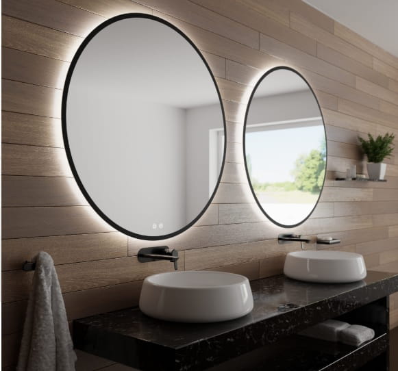 Okrągłe lustro LED z włącznikiem, ściemniaczem i zmianą barwy światła oraz matą grzewczą LOFT. Fi70 z w czarnej ramie idealne do łazienki, pokoju, przedpokoju, holu itp.
